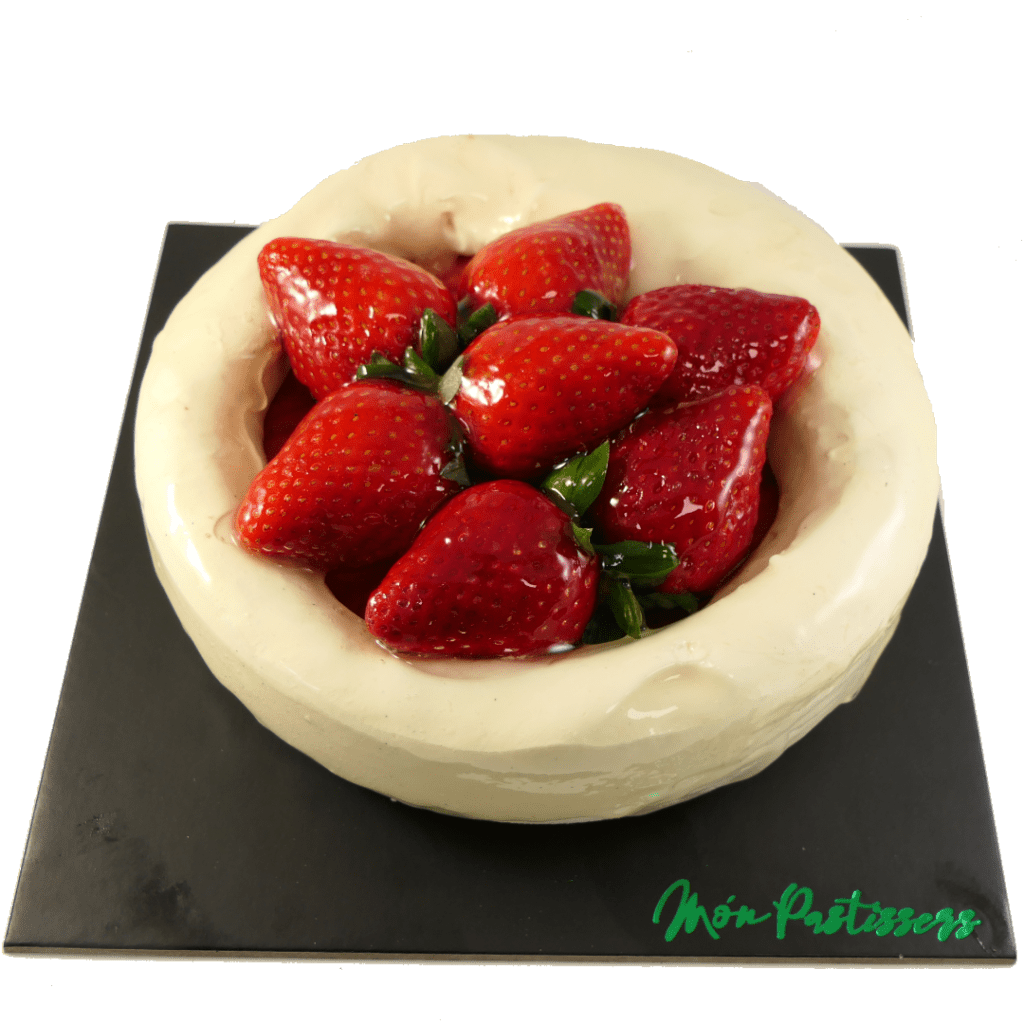 Namelaka de vainilla amb un interior de compota de maduixa natural, biscuit de mantega i cruixent d'ametlla